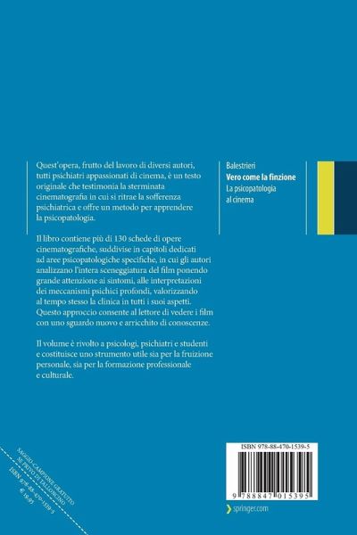 Parte I Cinema e psicopatologia.- Capitolo 1 Emozione e comprensione cinematografica.- Capitolo 2 Lo psicopatologo al cinema.- Capitolo 3 Lo psichiatra nel cinema.- Capitolo 4 Traiettorie dello sguardo. Dal buio della sala cinematografica alla stanza della terapia.- Capitolo 5 Il cinema nella didattica medica.- Parte II Filmografia.- Capitolo 6 Disturbi pervasivi dello sviluppo, ritardo mentale e disturbi mentali organici.- Capitolo 7 Psicosi.- Capitolo 8 Disturbi ansioso-fobici e ossessivo-compulsivi.- Capitolo 9 Disturbi post-traumatici.- Capitolo 10 Disturbi somatoformi e dissociativi.- Capitolo 11 Reazioni psicologiche alle malattie.- Capitolo 12 I contesti di cura.- Indice delle schede filmiche per capitolo.- Indice alfabetico dei film.Parte I Cinema e psicopatologia.- Capitolo 1 Emozione e comprensione cinematografica.- 1.1 Introduzione.- 1.2 Il cinema come storia narrata.- 1.3 Le strutture della narrativa.- 1.4 Le modalità della fruizione cinematografica.- 1.5 Empatia e condivisione emotiva.- 1.6 Stereotipi e stigma.- 1.7 Conclusioni.- Bibliografia.- Capitolo 2 Lo psicopatologo al cinema.- 2.1 Introduzione.- 2.2 Critica della visione ingenua.- 2.3 Il linguaggio del cinema.- 2.4 Critica della diagnosi psichiatrica al cinema.- 2.5 Il cinema è psichico.- 2.6 La visione après coup.- 2.7 Dall'impressione di realtà alla visione vera e propria.- Bibliografia.- Capitolo 3 Lo psichiatra nel cinema.- Capitolo 4 Traiettorie dello sguardo. Dal buio della sala cinematografica alla stanza della terapia.- 4.1 Introduzione.- 4.2 Dal buio della sala cinematografica alla stanza della terapia.- 4.3 Traiettorie dello sguardo.- 4.4 Conclusioni.- Bibliografia.- Capitolo 5 Il cinema nella didattica medica.- 5.1 Introduzione.- 5.2 Basi teoriche: la medicina narrativa.- 5.3 L'analisi di un film.- 5.4 Gli approcci didattici.- 5.5 Conclusioni.- Bibliografia.- Parte II Filmografia.- Capitolo 6 Disturbi pervasivi dello sviluppo, ritardo mentale e disturbi mentali organici.- 6.1 La rappresentazione dei disturbi al cinema.- 6.2 Schede filmiche.- Capitolo 7 Psicosi.- 7.1 La rappresentazione delle psicosi al cinema.- 7.2 Schede filmiche.- Capitolo 8 Disturbi ansioso-fobici e ossessivo-compulsivi.- 8.1 La rappresentazione dei disturbi d'ansia al cinema.- 8.2 Schede filmiche.- Capitolo 9 Disturbi post-traumatici.- 9.1 La rappresentazione dei disturbi post-traumatici al cinema.- 9.2 Schede filmiche.- Capitolo 10 Disturbi somatoformi e dissociativi.- 10.1 La rappresentazione dei disturbi somatoformi e dissociativi al cinema.- 10.2Schede filmiche.- Capitolo 11 Reazioni psicologiche alle malattie.- 11.1 La rappresentazione delle reazioni psicologiche alla malattia al cinema.- 11.2 Schede filmiche.- Capitolo 12 I contesti di cura.- 12.1 La rappresentazione dei contesti di cura nel cinema.- 12.2 Schede filmiche.- Indice delle schede filmiche per capitolo.- Indice alfabetico dei film.