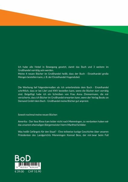 Ich habe alle Hebel in Bewegung gesetzt, damit das Buch und 3 weitere im Großhandel vorrätig sein werden.Meine 4 neuen Bücher im Großhandel heißt, dass der Buch - Einzelhandel große Mengen bestellen kann, z. B. der Einzelhandel Hugendubel. Die Werbung lief folgendermaßen ab: Ich unterbreitete dem Buch - Einzelhandel schriftlich, dass er bei Libri und KNV bestellen kann, wenn die Bücher dort vorrätig sind. Beigefügt habe ich ein Schreiben von Frau Anna Zimmermann, die mir versicherte, dass ich Bücher im Großhandel erwarten kann, wenn der Verlag Books on Demand GmbH dem Buch - Großhandel meine Bücher gut anpreist. Soweit nochmal meine neuen Bücher: Amerika - Der Ikea Riese kam leider nicht nach Memmingen, zu verdanken haben wir das unserem ehemaligen Bürgermeister Herrn Manfred Schilder. Was heißt Gefängnis für den Staat? - Eine teilweise lustige Geschichte über unseren Präsidenten des Landgerichts Memmingen Konrad Bess, der mir zwar beim Fall Katharina Huber Attenhausen (Betreuerin, Betreuung beendet) nicht weiterhelfen konnte, aber ...