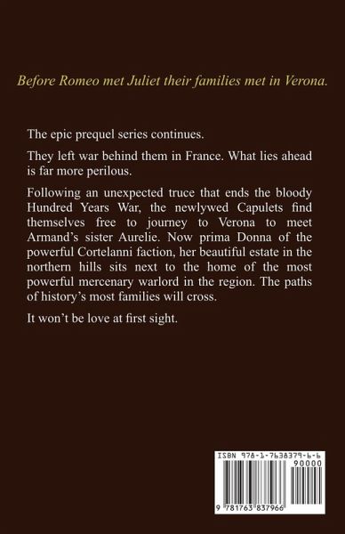 The epic prequel series continues. They left war behind them in France. What lies ahead is far more perilous. Following an unexpected truce that ends the bloody Hundred Years War, the newlywed Capulets find themselves free to journey to Verona to meet Armand's sister. But now they are married, Armand's small but colorful retinue, Marcel, Caspar and Fabrizio, must adjust to a new life in formidable feminine company, including their new mistress Ilaria de Capulet and her fiery new server. A pair of experienced Italian soldiers who served Armand's family for many years are assigned to protect them on the long journey. They know the path forward well. But navigating the adventurous road on their marriage tour, through the alps to northern Italy and onto Verona, will be full of surprises and perils. The glamorous young Capulets are to be wooed by influential famille and associates as they press on, hoping to win hearts and minds. Though not all will be so welcoming to the new faction leaders-in-waiting. Jealousies surface, personal ambitions are revealed in surprising moments that lead the newlyweds into danger. Yet the most perilous surprise awaits at their final destination. Armand's sister Aurelie is now prima Donna to the powerful Cortelanni faction in Verona. Settled in the northern hills with her husband Don Sabatino, their beautiful estate sits next to the ancestral home of the most powerful mercenary warlord in the region. The paths of two famous families will cross. The result will be startling. It won't be love at first sight.