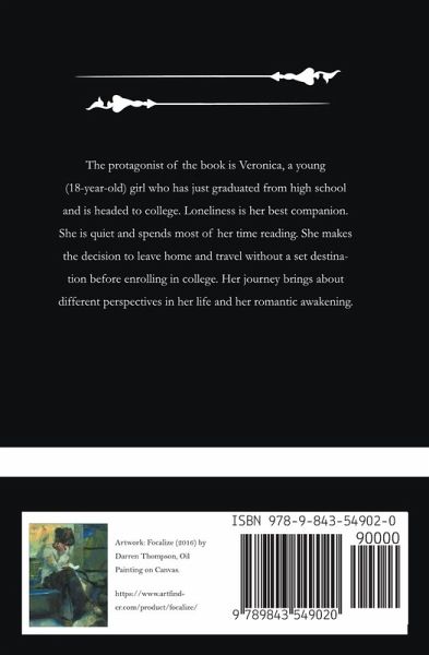 Veronica is a young (18-year-old) girl who recently graduated from high school and plans to attend college. Loneliness is her best companion. She has a quiet personality and spends the majority of her time reading. She decides to embark on an adventure with no set destination in order to see the world from another point of view. As she continues, different perspectives, including her romantic awakening, start to fill the void in her mind. As she drives through the streets and wanders around, she finds herself in places she has never been before. A quiet, empty motel, a cafe with old-fashioned people in a deserted area-entering all these becomes a discovery for her. The calm atmosphere and sudden downpour of rain bring a sense of nostalgia to her life. However, meeting a captivating college student named Olivia in the Ozarks brings a different flow of emotions into her life. The book is divided into twelve chapters with an epilogue, each titled after an art form that Veronica's feelings resonate with, which is mostly songs and sometimes poetry.