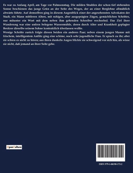 Es war zu Anfang April, am Tage vor Palmsonntag. Die milden Strahlen der schon tief stehenden Sonne beschienen das junge Grün an der Seite des Weges, der an einer Berglehne allmählich abwärts führte. Auf demselben ging in diesem Augenblick einer der angesehensten Advokaten der Stadt, ein Mann mittleren Alters, mit ruhigen, aber ausgeprägten Zügen, gemächlichen Schrittes, nur mitunter ein Wort mit dem neben ihm gehenden Schreiber wechselnd. Das Ziel ihrer Wanderung war eine unfern belegene Wassermühle, deren durch Alter und Krankheit geplagter Besitzer dieselbe seinem Sohne kontraktlich überlassen wollte. Wenige Schritte zurück folgte diesen beiden ein anderes Paar; neben einem jungen Manne mit frischem, intelligentem Antlitz ging eine schöne, noch sehr jugendliche Frau. Er sprach zu ihr; aber sie schien es nicht zu hören; aus ihren dunkeln Augen blickte sie schweigend vor sich hin, als wisse sie nicht, daß jemand an ihrer Seite gehe.
