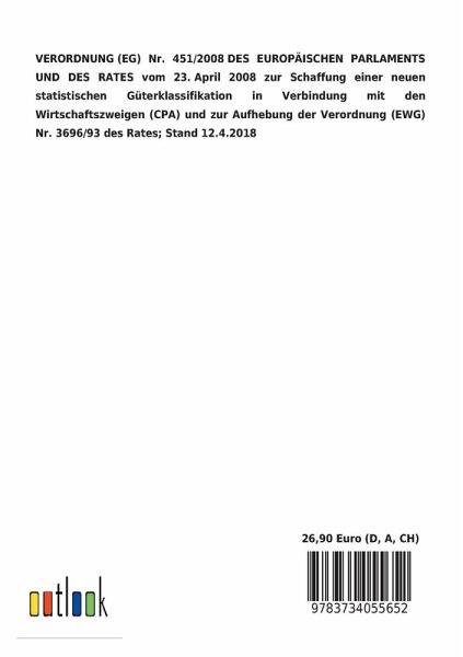 VERORDNUNG (EG) Nr. 451/2008 DES EUROPÄISCHEN PARLAMENTS UND DES RATES vom 23. April 2008 zur Schaffung einer neuen statistischen Güterklassifikation in Verbindung mit den Wirtschaftszweigen (CPA) und zur Aufhebung der Verordnung (EWG) Nr. 3696/93 des Rates; Stand 12.4.2018