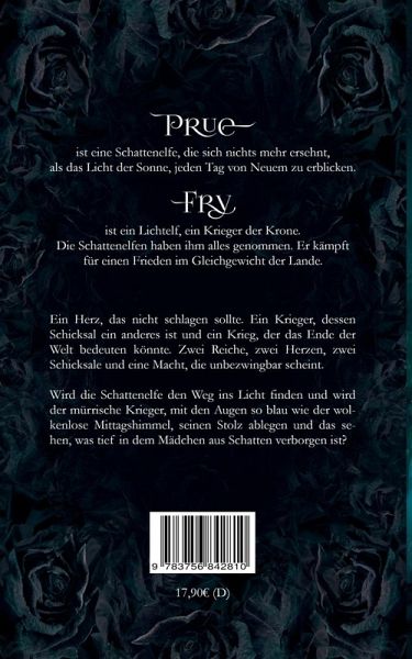 Prue ist eine Schattenelfe, die sich nichts mehr ersehnt, als das Licht der Sonne, jeden Tag von Neuem zu erblicken.Fry ist ein Lichtelf, ein Krieger der Krone. Die Schattenelfen haben ihm alles genommen. Er kämpft für einen Frieden im Gleichgewicht der Lande.Ein Herz, das nicht schlagen sollte. Ein Krieger, dessen Schicksal ein anderes ist und ein Krieg, der das Ende der Welt bedeuten könnte. Zwei Reiche, zwei Herzen, zwei Schicksale und eine Macht, die unbezwingbar scheint.Wird die Schattenelfe den Weg ins Licht finden und wird der mürrische Krieger, mit den Augen so blau wie der wolkenlose Mittagshimmel, seinen Stolz ablegen und das sehen, was tief in dem Mädchen aus Schatten verborgen ist?