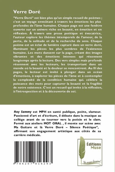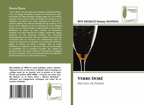 "Verre Doré" est bien plus qu'un simple recueil de poèmes ; c'est un voyage envoûtant à travers les émotions les plus profondes de l'âme humaine. Chaque page est une fenêtre ouverte sur un univers riche en beauté, en émotion et en réflexion. À travers une prose poétique et évocatrice, l'auteur explore les thèmes intemporels de l'amour, de la perte, de la solitude et de la recherche de sens. Chaque poème est un éclat de lumière capturé dans un verre doré, illuminant les pièces les plus sombres de l'existence humaine. Les mots dansent sur la page, créant des images vibrantes et des émotions intenses qui résonnent longtemps après la lecture. Des vers simples mais profonds résonnent avec les lecteurs, les transportant dans un monde où la beauté et la douleur se rencontrent. Au fil des pages, le lecteur est invité à plonger dans un océan d'émotions, à explorer les pièces de l'âme et à contempler la complexité de la condition humaine qui. célèbre la puissance des mots pour capturer la beauté et la fragilité de notre existence. C'est un recueil qui invite à la réflexion, à l'introspection et à la découverte de soi.