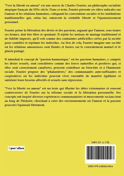 "Vers la liberté en amour" est une ¿uvre de Charles Fourier, un philosophe socialiste utopique français du XIXe siècle. Dans ce texte, Fourier présente ses idées radicales sur l'amour et les relations humaines, critiquant les conventions sociales et les institutions traditionnelles qui, selon lui, entravent la véritable liberté et l'épanouissement personnel. Fourier prône la libération des désirs et des passions, arguant que l'amour, sous toutes ses formes, doit être libre et spontané. Il rejette les notions de mariage traditionnel et de fidélité imposée, qu'il voit comme des contraintes artificielles créées par la société pour contrôler et réprimer les individus. Au lieu de cela, Fourier imagine une société où les relations amoureuses sont fluides et basées sur le consentement mutuel et le plaisir partagé. Il introduit le concept de "passion harmonique," où les passions humaines, y compris les désirs sexuels, sont considérées comme des forces naturelles et positives qui, si elles sont correctement canalisées, peuvent contribuer au bien-être et à l'harmonie sociale. Fourier propose des "phalanstères," des communautés auto-suffisantes et coopératives où les individus peuvent vivre ensemble de manière égalitaire et satisfaire leurs besoins affectifs et sexuels sans répression. "Vers la liberté en amour" est un texte qui illustre les idées visionnaires et souvent controversées de Fourier sur la réforme sociale et la libération personnelle. Ses concepts ont inspiré diverses expériences communautaires et mouvements sociaux tout au long de l'histoire, cherchant à créer des environnements où l'amour et la passion peuvent s'épanouir librement.