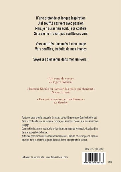 Écrivain à ses heures perdues, grifouilleur de mots, pseudo-poète des temps modernes ou simple faiseur de phrases, Damien Khérès est un jeune auteur de 28 ans. Enfant d'expatriés, il a vécu une partie de son enfance à l'étranger avant de revenir faire ses études en France. Ces années d'expatriation lui ont apporté une certaine ouverture d'esprit, un besoin permanent d'enrichissement culturel ainsi qu'un goût prononcé pour les voyages. Son écriture aux sonorités recherchées se rapproche étroitement du slam dans le rythme et l'expression tout en dégageant des émotions fortes. Elle traduit son amour des mots dans lequel il s'amuse à les triturer en exploitant leurs sons, leurs doubles sens et leurs forces. ''En poète et en ' rime ailleurs ', Damien Khérès, tel un Clément Marot des temps modernes, teinte ses vers d'une coloration humoristiques, réalistes, parfois fantaisistes'' Anne Locqueneaux, Tous Montreuil ''Un auteur à suivre... '' Ondine Benetier, SFR Jeunes Talents