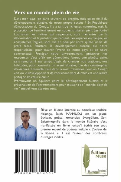 Dans mon pays, on parle souvent de progrès, mais qu'en est-il du développement durable, de notre propre succès ? En République démocratique du Congo, il y a tant de richesses naturelles, mais la protection de l'environnement est souvent mise en péril. Les forêts luxuriantes, les rivières qui serpentent, sont menacées par la déforestation et la pollution qui hantent. Les espèces en danger, les écosystèmes fragiles, sont mis en péril par notre quête infinie de profit facile. Pourtant, le développement durable est notre responsabilité, pour assurer l'avenir de notre pays et de notre communauté. Protéger notre environnement, préserver nos ressources, c'est offrir aux générations futures une planète saine, sans remords. Il est temps d'agir, de changer nos pratiques, nos habitudes, pour construire un avenir durable, loin des catastrophes diluviennes. Ensemble main dans la main travaillons pour un Congo vert où le développement de l'environnement durable est une réalité partagée de coeur à coeur.Promouvons un équilibre entre le développement humain et la préservation de l'environnement pour assister à ce " monde plein de vie " auquel nous aspirons tous.