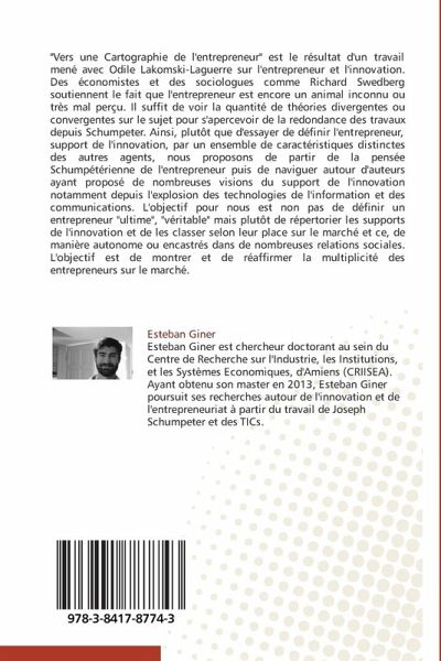 "Vers une Cartographie de l'entrepreneur" est le résultat d'un travail mené avec Odile Lakomski-Laguerre sur l'entrepreneur et l'innovation. Des économistes et des sociologues comme Richard Swedberg soutiennent le fait que l'entrepreneur est encore un animal inconnu ou très mal perçu. Il suffit de voir la quantité de théories divergentes ou convergentes sur le sujet pour s'apercevoir de la redondance des travaux depuis Schumpeter. Ainsi, plutôt que d'essayer de définir l'entrepreneur, support de l'innovation, par un ensemble de caractéristiques distinctes des autres agents, nous proposons de partir de la pensée Schumpétérienne de l'entrepreneur puis de naviguer autour d'auteurs ayant proposé de nombreuses visions du support de l'innovation notamment depuis l'explosion des technologies de l'information et des communications. L'objectif pour nous est non pas de définir un entrepreneur "ultime", "véritable" mais plutôt de répertorier les supports de l'innovation et de les classer selon leur place sur le marché et ce, de manière autonome ou encastrés dans de nombreuses relations sociales. L'objectif est de montrer et de réaffirmer la multiplicité des entrepreneurs sur le marché.