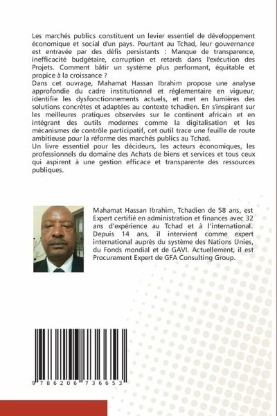 Les marchés publics constituent un levier essentiel de développement économique et social d'un pays. Pourtant au Tchad, leur gouvernance est entravée par des défis persistants : Manque de transparence, inefficacité budgétaire, corruption et retards dans l'exécution des Projets. Comment bâtir un système plus performant, équitable et propice à la croissance ?Dans cet ouvrage, Mahamat Hassan Ibrahim propose une analyse approfondie du cadre institutionnel et réglementaire en vigueur, identifie les dysfonctionnements actuels, et met en lumières des solutions concrètes et adaptées au contexte tchadien. En s'inspirant sur les meilleures pratiques observées sur le continent africain et en intégrant des outils modernes comme la digitalisation et les mécanismes de contrôle participatif, cet outil trace une feuille de route ambitieuse pour la réforme des marchés publics au Tchad.Un livre essentiel pour les décideurs, les acteurs économiques, les professionnels du domaine des Achats de biens et services et tous ceux qui aspirent à une gestion efficace et transparente des ressources publiques.