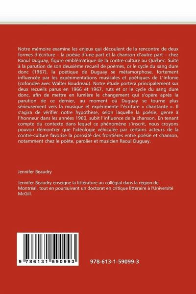 Notre mémoire examine les enjeux qui découlent de la rencontre de deux formes d'écriture la poésie d'une part et la chanson d'autre part chez Raoul Duguay, figure emblématique de la contre-culture au Québec. Suite à la parution de son deuxième recueil de poèmes, or le cycle du sang dure donc (1967), la poétique de Duguay se métamorphose, fortement influencée par les expérimentations musicales et poétiques de L'Infonie (cofondée avec Walter Boudreau). Notre étude portera principalement sur deux recueils parus en 1966 et 1967, ruts et or le cycle du sang dure donc, afin de mettre en lumière le changement qui s'opère après la parution de ce dernier, au moment où Duguay se tourne plus sérieusement vers la musique et expérimente l'écriture " chantante ". Il s'agira de vérifier notre hypothèse, selon laquelle la poésie, genre à l'honneur dans les années 1960, subit l'influence de la chanson. En tenant compte du contexte dans lequel ce phénomène s'inscrit, nous croyons pouvoir démontrer que l'idéologie véhiculée par certains acteurs de la contre-culture favorise la porosité des frontières entre poésie et chanson, notamment chez le poète, parolier et musicien Raoul Duguay.