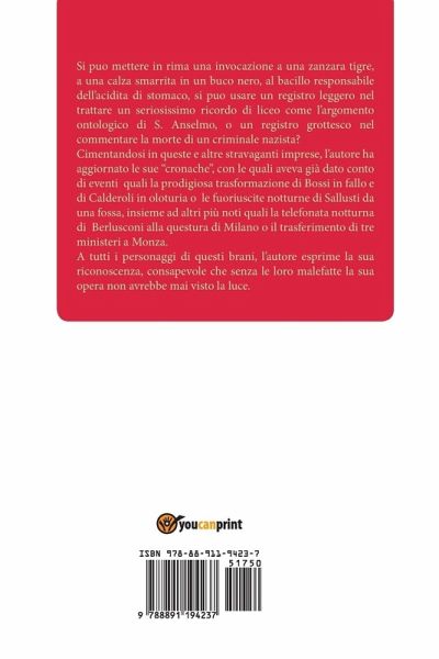 Si puo mettere in rima una invocazione a una zanzara tigre, a una calza smarrita in un buco nero, al bacillo responsabile dell'acidita di stomaco, si puo usare un registro leggero nel trattare un seriosissimo ricordo di liceo come l'argomento ontologico di S. Anselmo, o un registro grottesco nel commentare la morte di un criminale nazista ? Cimentandosi in queste e altre stravaganti imprese, l'autore ha aggiornato le sue ""cronache"", con le quali aveva già dato conto di eventi quali la prodigiosa trasformazione di Bossi in fallo e di Calderoli in oloturia o le fuoriuscite notturne di Sallusti da una fossa, insieme ad altri più noti quali la telefonata notturna di Berlusconi alla questura di Milano o il trasferimento di tre ministeri a Monza. A tutti i personaggi di questi brani, l'autore esprime la sua riconoscenza, consapevole che senza le loro malefatte la sua opera non avrebbe mai visto la luce.