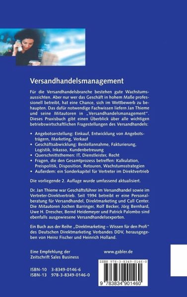 Dr. Jan Thieme war Geschäftsführer im B-to-B- und im B-to-C-Versandhandel sowie im Vertreter-Direktvertrieb. Seit 1994 be-treibt er eine Personalberatung für Versandhandel, Direktmarke-ting und Call Center. Die Mitautoren Jochen Barringer, Rolf Becker, Jörg Bernhard, Uwe H. Drescher, Bernd Heidemeyer und Patrick Palombo sind ebenfalls ausgewiesene Versandhandelsexperten.