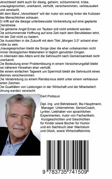 Verschleiert steht auch für diesig, geheim, schlummernd, trübe, unausgesprochen, unerkannt, verhüllt, verschwommen, verklausuliert und verwischt.Mit dem Band "Verschleiert" will der Autor ein wenig hinter die Kulissen des Menschlichen schauen.Er trifft auf die diesige unterbewusste Vorbereitung auf eine geplante Dienstreise. Die geheime Angst Ernas vor Tauben soll nicht entdeckt werden. Die schlummernde Hoffnung auf eine Zeit nach dem Berufsleben lehrt, mit der Zeit nicht zu hadern. Die Aussichten in die Zukunft mit dem Titel "Morgen 3.0" scheint eher trübe zu sein. Unausgesprochen bleibt die Sorge über die eher unbekannten nicht immer ökologischen Materialien in täglich genutzten Dingen. Im Alleinsein des Alters wird die Sehnsucht nach Gemeinsamkeit nicht unerkannt.Die Bedeutung einer Problemlösung in einem Versicherungsfall bleibt bei näherem Hinsehen eher verhüllt.Bei einem einfachen Tagwerk um Sperrmüll bleibt die Sehnsucht eines Mannes verschwommen.Die Verabredung zu einem Rendezvous steht unter einem verklausulierten Zeichen.Die Qualitäten von Leistungen in der Wirtschaft und der Mitarbeiterführung werden verwischt.