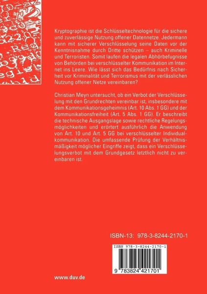 Christian Meyn untersucht, ob ein Verbot der Verschlüsselung mit den Grundrechten vereinbar ist, insbesondere mit dem Kommunikationsgeheimnis (Art. 10 Abs. 1 GG) und der Kommunikationsfreiheit (Art. 5 Abs. 1 GG). Er beschreibt die technische Ausgangslage sowie rechtliche Regelungsmöglichkeiten und erörtert ausführlich die Anwendung von Art. 10 und Art. 5 GG bei verschlüsselter Individualkommunikation. Die umfassende Prüfung der Verhältnismäßigkeit möglicher Eingriffe zeigt, dass ein Verschlüsselungsverbot mit dem Grundgesetz letztlich nicht zu vereinbaren ist.