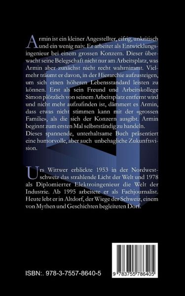 Armin ist ein kleiner Angestellter, eifrig, unkritisch und ein wenig naiv. Er arbeitet als Entwicklungsingenieur bei einem grossen Konzern. Dieser überwacht seine Belegschaft nicht nur am Arbeitsplatz, was Armin aber zunächst nicht recht wahrnimmt. Vielmehr träumt er davon, in der Hierarchie aufzusteigen, um sich einen höheren Lebensstandard leisten zu können. Erst als sein Freund und Arbeitskollege Simon plötzlich von seinem Arbeitsplatz entfernt wird und nicht mehr aufzufinden ist, dämmert es Armin, dass etwas nicht stimmen kann, mit der «grossen Familie», als die sich der Konzern ausgibt. Armin beginnt zum ersten Mal selbstständig zu handeln.Dieses spannende, unterhaltsame Buch präsentiert eine humorvolle, aber auch unbehagliche Zukunftsvision.