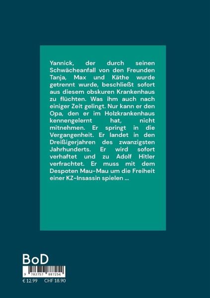 Yannick, der durch seinen Schwächeanfall von den Freunden Tanja, Max und Käthe wurde getrennt wurde, beschließt sofort aus diesem obskuren Krankenhaus zu flüchten. Was ihm auch nach einiger Zeit gelingt. Nur kann er den Opa, den er im Holzkrankenhaus kennengelernt hat, nicht mitnehmen. Er springt in die Vergangenheit. Er landet in den Dreißigerjahren des zwanzigsten Jahrhunderts. Er wird sofort verhaftet und zu Adolf Hitler verfrachtet. Er muss mit dem Despoten Mau-Mau um die Freiheit einer KZ-Insassin spielen ...