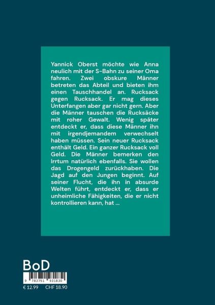 Yannick Oberst möchte wie Anna neulich mit der S-Bahn zu seiner Oma fahren. Zwei obskure Männer betreten das Abteil und bieten ihm einen Tauschhandel an. Rucksack gegen Rucksack. Er mag dieses Unterfangen aber gar nicht gern. Aber die Männer tauschen die Rucksäcke mit roher Gewalt. Wenig später entdeckt er, dass diese Männer ihn mit irgendjemandem verwechselt haben müssen. Sein neuer Rucksack enthält Geld. Ein ganzer Rucksack voll Geld. Die Männer bemerken den Irrtum natürlich ebenfalls. Sie wollen das Drogengeld zurückhaben. Die Jagd auf den Jungen beginnt. Auf seiner Flucht, die ihn in absurde Welten führt, entdeckt er, dass er unheimliche Fähigkeiten, die er nicht kontrollieren kann, hat ...