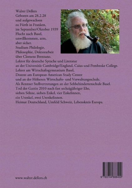 Walter Dellers Geboren am 28.2.28 und aufgewachsen zu Fürth in Franken, im September/Oktober 1939 Flucht nach Basel, unwillkommen, arm, aber sicher. Studium Philologie, Philosophie, Doktorarbeit über Clemens Brentano. Lektor für deutsche Sprache und Literatur an der Universität Cambridge/England, Caius und Pembroke College. Lehrer am Wirtschaftsgymnasium Basel, Dozent am European American Study Center und an der Höheren Wirtschafts- und Verwaltungsschule. Als Rentner Stellvertretungen an der Sehbehindertenschule Basel. Tod der Gattin 2010 nach fast sechzigjähriger Ehe, sieben Söhne, sieben Enkel, vier Enkelinnen, ein Urenkel, zwei Urenkelinnen. Heimat Deutschland, Umfeld Schweiz, Lebenskreis Europa.