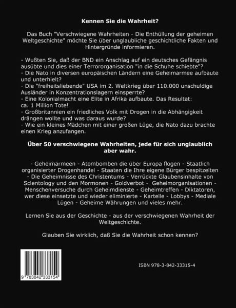 Kennen Sie die Wahrheit?Das Buch "Verschwiegene Wahrheiten - Die Enthüllung der geheimen Weltgeschichte" möchte Sie über unglaubliche geschichtliche Fakten und Hintergründe informieren.- Wußten Sie, daß der BND ein Anschlag auf ein deutsches Gefängnis ausübte und dies einer Terrororganisation "in die Schuhe schiebte"?- Die Nato in diversen europäischen Ländern eine Geheimarmee aufbaute und unterhielt? - Die "freiheitsliebende" USA im 2. Weltkrieg über 110.000 unschuldige Ausländer in Konzentrationslagern einsperrte? - Eine Kolonialmacht eine Elite in Afrika aufbaute. Das Resultat: ca. 1 Million Tote! - Großbritannien ein friedliches Volk mit Drogen in die Abhängigkeit drängen wollte und was daraus wurde?- Wie ein kleines Mädchen mit einer großen Lüge, die Nato dazu brachte einen Krieg anzufangen.Über 50 verschwiegene Wahrheiten, jede für sich unglaublich aber wahr. - Geheimarmeen - Atombomben die über Europa flogen - Staatlich organisierter Drogenhandel - Staaten die Ihre eigene Bürger bespitzelten - Die Geheimnisse des Christentums - Verrückte Glaubensinhalte von Scientology und den Mormonen - Goldverbot - Geheimorganisationen - Menschenversuche durch Geheimdienste - Geheimtreffen - Diktatoren, wer diese einsetzte und wieder eliminierte - Kartelle - Lobbys - Mediale Lügen - Geheime Währungen und vieles mehr.Lernen Sie aus der Geschichte - aus der verschwiegenen Wahrheit der Weltgeschichte.Glauben Sie wirklich, daß Sie die Wahrheit schon kennen?