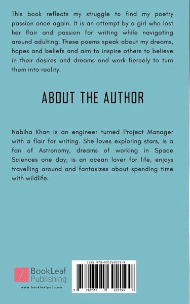 This book reflects my struggle to find my poetry passion once again. It is an attempt by a girl who lost her flair and passion for writing while navigating around adulting. These poems speak about my dreams, hopes and beliefs and aim to inspire others to believe in their desires and dreams and work fiercely to turn them into reality.