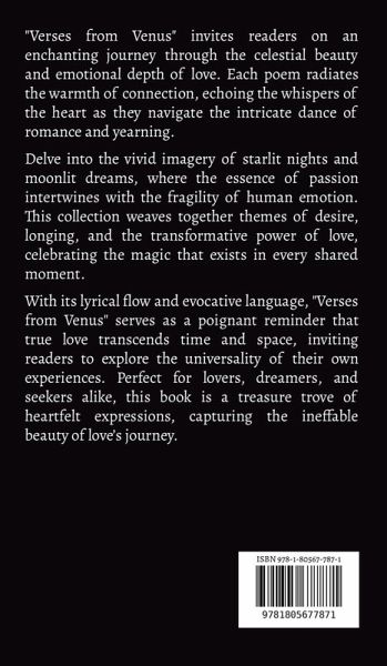 "Verses from Venus" invites readers on an enchanting journey through the celestial beauty and emotional depth of love. Each poem radiates the warmth of connection, echoing the whispers of the heart as they navigate the intricate dance of romance and yearning. Delve into the vivid imagery of starlit nights and moonlit dreams, where the essence of passion intertwines with the fragility of human emotion. This collection weaves together themes of desire, longing, and the transformative power of love, celebrating the magic that exists in every shared moment. With its lyrical flow and evocative language, "Verses from Venus" serves as a poignant reminder that true love transcends time and space, inviting readers to explore the universality of their own experiences. Perfect for lovers, dreamers, and seekers alike, this book is a treasure trove of heartfelt expressions, capturing the ineffable beauty of love's journey.