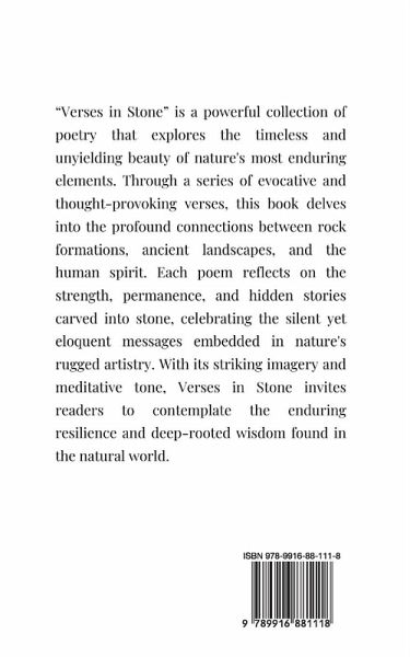 "Verses in Stone" invites readers on a lyrical journey through time, exploring the enduring power of words etched in the fabric of nature and memory. Each poem serves as a testament to the strength and fragility of human experiences, reflecting themes of love, loss, resilience, and the beauty found in the passage of time. Crafted with evocative imagery and poignant language, this collection captures the essence of moments that shape our lives, likening them to weathered stones that bear the imprints of countless stories. As you delve into its pages, you will uncover the wisdom and grace hidden within life's challenges, reminding us that every verse, like every stone, has a story to tell. Join the author as they transform the mundane into the magnificent, revealing the profound connections we share with our surroundings, and find solace in the knowledge that our experiences, both joyful and sorrowful, are carved into the tapestry of existence.