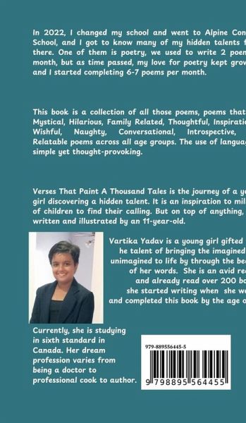 This Chap book is a collection of all those poems, poems that are Mystical, Hilarious, Family Related, Thoughtful, Inspirational, Wishful, Naughty, Conversational, Introspective, and Relatable poems across all age groups. The use of language is simple yet thought-provoking. Verses That Paint A Thousand Tales is the journey of a young girl discovering a hidden talent. It is an inspiration to millions of children to find their calling. But on top of anything, it is written and illustrated by an 11-year-old.