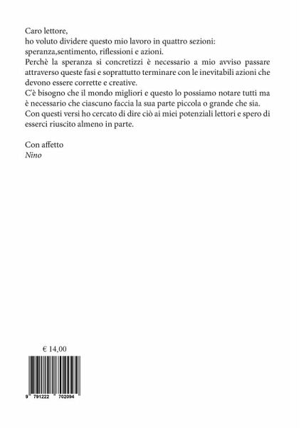 "Ho voluto dividere questo mio lavoro in quattro sezioni: speranza, sentimento, riflessioni e azioni. Perché la speranza si concretizzi è necessario a mio avviso passare attraverso queste fasi e soprattutto terminare con le inevitabili azioni che devono essere corrette e creative. C'è bisogno che il mondo migliori e questo lo possiamo notare tutti ma è necessario che ciascuno faccia la sua parte piccola o grande che sia. Con questi versi ho cercato di dire ciò ai miei potenziali lettori e spero di esserci riuscito almeno in parte" (l'autore)
