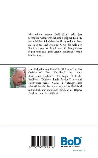 Mit seinem neuen Gedichtband geht Jan Stechpalm wieder ironisch und bissig den kleinen, menschlichen Schwächen im Alltag nach und fasst sie in spitze und spritzige Verse, die teils der Tradition von W. Busch und C. Morgenstern folgen und teils ganz eigene, sprachliche Wege beschreiten ...