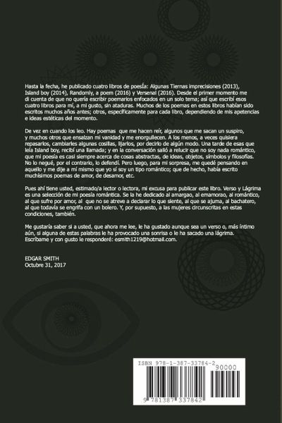 Verso y Lágrima es una selección de la poesía romántica de Edgar Smith. Aquí encontrará poemas de amor, desamor, melancolía, nostalgia... El poeta cuenta con un amplio repertorio, y escribe con la certeza del conocedor del lenguaje y la pasión de quien ha experimentado y observado la vida. Es un libro para leer y retornar a él, acompañados tal vez de un buen vino, de un café y un bolero.