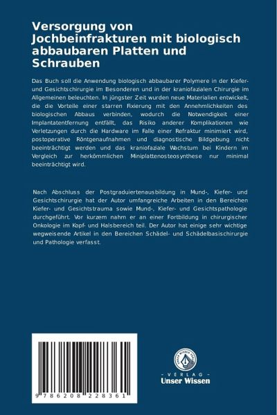 Das Buch soll die Anwendung biologisch abbaubarer Polymere in der Kiefer- und Gesichtschirurgie im Besonderen und in der kraniofazialen Chirurgie im Allgemeinen beleuchten. In jüngster Zeit wurden neue Materialien entwickelt, die die Vorteile einer starren Fixierung mit den Annehmlichkeiten des biologischen Abbaus verbinden, wodurch die Notwendigkeit einer Implantatentfernung entfällt, das Risiko anderer Komplikationen wie Verletzungen durch die Hardware im Falle einer Refraktur minimiert wird, postoperative Röntgenaufnahmen und diagnostische Bildgebung nicht beeinträchtigt werden und das kraniofaziale Wachstum bei Kindern im Vergleich zur herkömmlichen Miniplattenosteosynthese nur minimal beeinträchtigt wird.