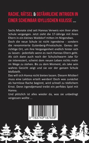 Rache, Rätsel & gefährliche Intrigen in einer scheinbar idyllischen Kulisse»Verbrenn dich nicht... Dieses Spiel spiele ich viel besser als du, Schlampe.«Sechs Monate sind seit Hannas Verweis von ihrer alten Schule vergangen. Jetzt zieht die 17-Jährige mit ihren Eltern in ein kleines Walddorf mitten im Nirgendwo. Doch die neue Schule ist nicht irgendeine - sondern die renommierte Gutenberg-Privatschule. Genau der richtige Ort, um ihre Vergangenheit endlich hinter sich zu lassen - jedenfalls wenn es nach Hannas Eltern geht. Als sich dann auch noch der Schulschwarm Jake für sie interessiert, scheint dem neuen Leben nichts mehr im Wege zu stehen. Bis zu dem Moment, als Jake sein wahres Gesicht zeigt und sie vor der ganzen Schule bloßstellt.Das will sich Hanna nicht bieten lassen. Diesem Mistkerl muss eine Lektion erteilt werden! Doch was zunächst als harmlose Rache beginnt, wird schnell zu tödlichem Ernst. Denn irgendjemand treibt ein perfides Spiel mit Hanna. Und plötzlich ist alleswieder da, was sie unbedingt vergessen wollte ...