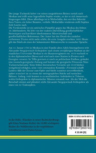 In der Reihe »Klassiker in neuer Rechtschreibung« gibt Klara Neuhaus-Richter die wichtigsten Bücher der Weltliteratur in der empfohlenen Schreibweise nach Duden heraus. Alexander Gribojedow: Verstand schafft Leiden. Komödie in vier Akten Der junge Tschatzki kehrt von seinen ausgedehnten Reisen zurück nach Moskau und trifft seine Jugendliebe Sophie wieder, zu der er sich immernoch hingezogen fühlt. Diese allerdings ist in Moltschálin, den servilen Sekretär ihres Vaters, ein hoher Beamter, verliebt. Moltschálin wiederum stellt Sophies Zofe Lisette nach. Die Verskomödie ist ein satirisches Pamphlet gegen das Moskau des frühen 19. Jahrhunderts. Sie lebt von der exakten Darstellung gesellschaftlicher Stereotypen und karrikiert überkommene Misswirtschaft und gesellschaftlichen Reformstau. Der Autor hat den Druck des zunächst verbotenen Textes nicht mehr erlebt, die erste Ausgabe erschien 1833. Heute gilt das Stück als eines der bekanntesten Bühnenwerke in russischer Sprache. Entstanden zwischen 1822 und 1824. Erstdruck 1825. Hier in der Übersetzung von Georg Julius von Schultz unter dem Pdeudonym »Dr. Bertram«, erschienen 1853 bei Brockhaus in Leipzig. Auch erschienen unter dem Titel »Wehe dem Verstand«. Neu herausgegeben von Klara Neuhaus-Richter, Berlin 2023. Umschlaggestaltung von Rainer Richter unter Verwendung einer Porträtzeichnung von Josefine Weinschrott. Gesetzt aus der Minion Pro, 11 pt. Henricus - Edition Deutsche Klassik GmbH Über den Autor: Am 15. Januar 1795 in Moskau in eine Familie alten Adels hineingeboren tritt Alexander Sergejewitsch Gribojedow nach einem zweijährigen Studium an der staatlichen Universität Moskau in ein Husarenregiment ein. 1818 wechselt er in den diplomatischen Dienst und wird nach einer Station in Persien nach Georgien versetzt. In Tiflis gewinnt er rasch an politischem Einfluss, gründet eine russisch-georgische Zeitung und heiratet die georgische Prinzessin Nino Tschawtschawadse. Seine frühen literarischen Versuche seit 1816 bleiben weitgehend erfolglos, seine 1824 entstandene Komödie »Verstand schafft Leiden« fällt der Zensur zum Opfer und bleibt zunächst unveröffentlicht, später avanciert sie zu einem der meistgespielten Stücke auf russischen Bühnen. Anfang 1829 kommt es zu muslimischen Aufständen in Teheran, wohin Gribojedow in diplomatischer Mission entsandt war. Als der Mob die Botschaft stürmt und plündert stirbt Alexander Sergejewitsch Gribojedow als eines von 45 Todesopfern.