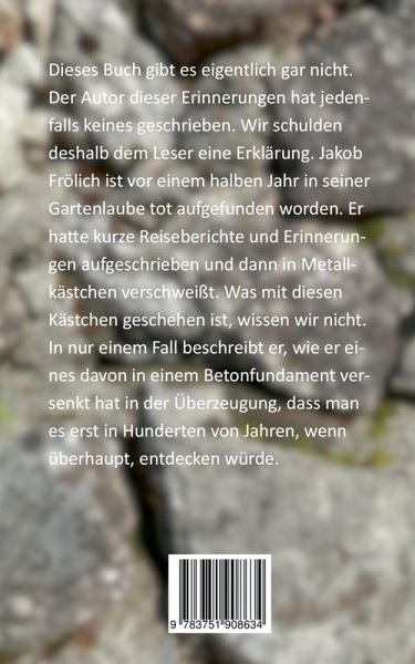 Jakob Frölich erfährt von seinem Arzt, dass er nur noch einige Wochen zu leben hat. Der Krebs habe ihn ganz aufgefressen. Jakob beschließt, seine Erinnerungen und die Reisen, die ihn quer durch die Welt geführt haben, festzuhalten und die Manuskripte an geheimen Orten zu verstecken.