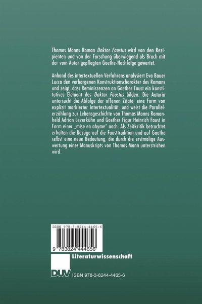 Anhand des intertextuellen Verfahrens analysiert Eva Bauer Lucca den verborgenen Konstruktionscharakter des Romans und zeigt, dass Reminiszenzen an Goethes Faust ein konstitutives Element des Doktor Faustus bilden. Die Autorin untersucht die Abfolge der offenen Zitate, eine Form von explizit markierter Intertextualität, und weist die Parallelerzählung zur Lebensgeschichte von Thomas Manns Romanheld Adrian Leverkühn und Goethes Figur Heinrich Faust in Form einer "mise en abyme" nach. Als Zeitkritik betrachtet erhalten die Bezüge auf die Fausttradition und auf Goethe selbst eine neue Bedeutung, die durch die erstmalige Auswertung eines Manuskripts von Thomas Mann unterstrichen wird.