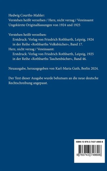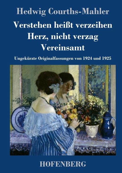 Hedwig Courths-Mahler: Verstehen heißt verzeihen / Herz, nicht verzag / Vereinsamt. Ungekürzte Originalfassungen von 1924 und 1925 Verstehen heißt verzeihen: Erstdruck: Verlag von Friedrich Rothbarth, Leipzig, 1924 in der Reihe »Rothbarths Volksbücher«, Band 17. Herz, nicht verzag: Erstdruck: Verlag von Friedrich Rothbarth, Leipzig, 1925 in der Reihe »Rothbarths Taschenbücher«, Band 46. Vereinsamt: Erstdruck: Verlag von Friedrich Rothbarth, Leipzig, 1925 in der Reihe »Rothbarths Taschenbücher«, Band 46. Neuausgabe, herausgegeben von Karl-Maria Guth, Berlin 2024. Der Text dieser Ausgabe wurde behutsam an die neue deutsche Rechtschreibung angepasst. Umschlagabbildung: Frederick Carl Frieseke, Mädchen in Blau ordnet Blumen, 1915 Gesetzt aus der Minion Pro, 11 pt. Henricus - Edition Deutsche Klassik GmbH