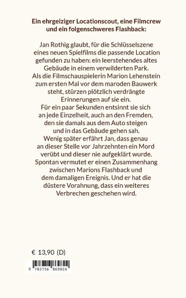Ein ehrgeiziger Locationscout, eine Filmcrew und ein folgenschweres Flashback:Jan Rothig glaubt, für die Schlüsselszene eines neuen Spielfilms die passende Location gefunden zu haben: ein leerstehendes altes Gebäude in einem verwilderten Park.Als die Filmschauspielerin Marion Lehenstein zum ersten Mal vor dem maroden Bauwerk steht, stürzen plötzlich verdrängte Erinnerungen auf sie ein. Für ein paar Sekunden entsinnt sie sich an jede Einzelheit, auch an den Fremden, den sie damals aus dem Auto steigen und in das Gebäude gehen sah.Wenig später erfährt Jan, dass genau an dieser Stelle vor Jahrzehnten ein Mord verübt und dieser nie aufgeklärt wurde. Spontan vermutet er einen Zusammenhang zwischen Marions Flashback und dem damaligen Ereignis. Und er hat die düstere Vorahnung, dass ein weiteres Verbrechen geschehen wird.