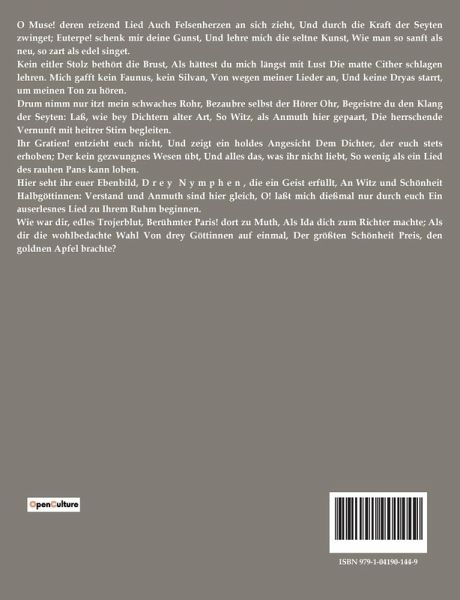 O Muse! deren reizend Lied Auch Felsenherzen an sich zieht, Und durch die Kraft der Seyten zwinget; Euterpe! schenk mir deine Gunst, Und lehre mich die seltne Kunst, Wie man so sanft als neu, so zart als edel singet. Kein eitler Stolz bethört die Brust, Als hättest du mich längst mit Lust Die matte Cither schlagen lehren. Mich gafft kein Faunus, kein Silvan, Von wegen meiner Lieder an, Und keine Dryas starrt, um meinen Ton zu hören. Drum nimm nur itzt mein schwaches Rohr, Bezaubre selbst der Hörer Ohr, Begeistre du den Klang der Seyten: Laß, wie bey Dichtern alter Art, So Witz, als Anmuth hier gepaart, Die herrschende Vernunft mit heitrer Stirn begleiten. Ihr Gratien! entzieht euch nicht, Und zeigt ein holdes Angesicht Dem Dichter, der euch stets erhoben; Der kein gezwungnes Wesen übt, Und alles das, was ihr nicht liebt, So wenig als ein Lied des rauhen Pans kann loben. Hier seht ihr euer Ebenbild, D r e y N y m p h e n , die ein Geist erfüllt, An Witz und Schönheit Halbgöttinnen: Verstand und Anmuth sind hier gleich, O! laßt mich dießmal nur durch euch Ein auserlesnes Lied zu Ihrem Ruhm beginnen. Wie war dir, edles Trojerblut, Berühmter Paris! dort zu Muth, Als Ida dich zum Richter machte; Als dir die wohlbedachte Wahl Von drey Göttinnen auf einmal, Der größten Schönheit Preis, den goldnen Apfel brachte?