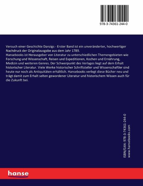Versuch einer Geschichte Danzigs - Erster Band ist ein unveränderter, hochwertiger Nachdruck der Originalausgabe aus dem Jahr 1789.