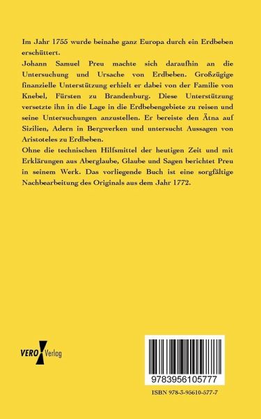 Johann Samuel Preu machte sich daraufhin an die Untersuchung und Ursache von Erdbeben. Großzügige finanzielle Unterstützung erhielt er dabei von der Familie von Knebel, Fürsten zu Brandenburg. Diese Unterstützung versetzte ihn in die Lage in die Erdbebengebiete zu reisen und seine Untersuchungen anzustellen. Er bereiste den Ätna auf Sizilien, Adern in Bergwerken und untersucht Aussagen von Aristoteles zu Erdbeben.