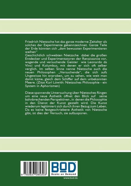 Friedrich Nietzsche hat das ganze moderne Zeitalter als solches der Experimente gekennzeichnet. Ganze Teile der Erde könnten sich "dem bewussten Experimentieren weihen" Geschichtlich schwebten Nietzsche dabei die großen Entdecker und Experimentatoren der Renaissance vor, wagende und versuchende Geister wie Leonardo da Vinci und Kolumbus, mit denen er sich oft selber verglich. Im selben Sinne nenne Nietzsche auch die neuen Philosophen "Versuchende", die sich aufs Ungewisse hin erproben, um zu sehen, wie weit man damit käme, gleich dem Schiffer auf dem unbekannten Meere. (Zitat Karl Löwith: Nietzsches Philosophie - ein System in Aphorismen) Diese spannende Untersuchung über Nietzsches Ringen um eine neue Ästhetik öffnet den Blick auf seine bahnbrechenden Perspektiven , in denen die Philosophie in den Dienst der Kunst gestellt wird. Die Kunst wiederum legitimiert sich durch ihren Bezug zum Leben. Da es keine festgeschriebene Ästhetik von Nietzsche gibt, ist dies der Versuch, sie aufzuspüren.