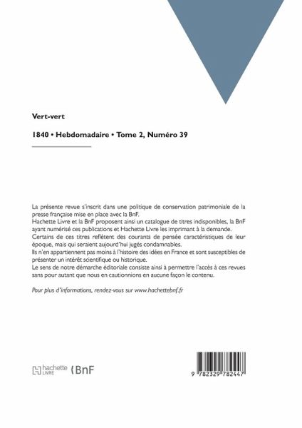 Vert-vert: journal des salons et des théâtres Date de l'édition originale: 1840 La présente revue s'inscrit dans une politique de conservation patrimoniale de la presse française mise en place avec la BnF. Hachette Livre et la BnF proposent ainsi un catalogue de titres indisponibles, la BnF ayant numérisé ces publications et Hachette Livre les imprimant à la demande. Certains de ces titres reflètent des courants de pensée caractéristiques de leur époque, mais qui seraient aujourd'hui jugés condamnables. Ils n'en appartiennent pas moins à l'histoire des idées en France et sont susceptibles de présenter un intérêt scientifique ou historique. Le sens de notre démarche éditoriale consiste ainsi à permettre l'accès à ces revues sans pour autant que nous en cautionnions en aucune façon le contenu. Pour plus d'informations, rendez-vous sur www.hachettebnf.fr