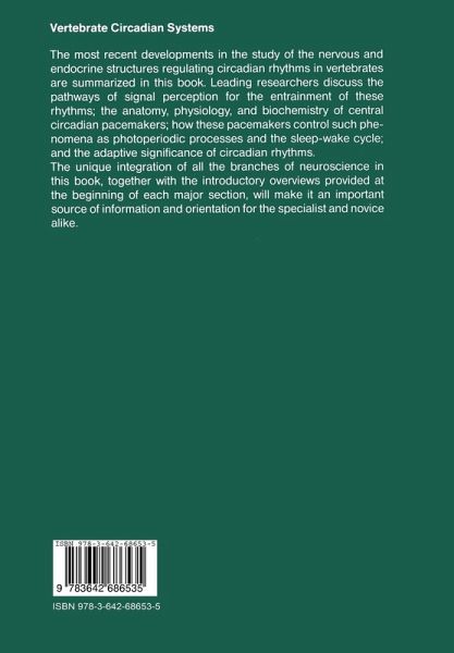 1 Introduction.- 1.1 The Search for Principles of Physiological Organization in Vertebrate Circadian Systems.- 1.2 Zeitgebers, Entrainment, and Masking: Some Unsettled Questions.- 2 Pathways of Zeitgeber Signals.- 2.1 Comparative Aspects of Retinal and Extraretinal Photosensory Input Channels Entraining Endogenous Rhythms.- 2.2 Neuroanatomical Pattern of Endocrine and Oscillatory Systems of the Brain: Retrospect and Prospect.- 2.3 Unspecific Optic Fibres and Their Terminal Fields.- 2.4 Characteristics of the Interaction Between the Central Circadian Mechanism and the Retina in Rabbits.- 3 The Role of the Nucleus Suprachiasmaticus.- 3.1 Physiological Models of the Rodent Circadian System.- 3.2 Neuroanatomical Organization and Connections of the Suprachiasmatic Nucleus.- 3.3 CNS Structures Controlling Circadian Neuroendocrine and Activity Rhythms in Rats.- 3.4 The Neurophysiology of the Mammalian Suprachiasmatic Nucleus and Its Visual Afferents.- 3.5 Neurophysiological Studies of the SCN in the Rat and in the Java Sparrow.- 3.6 Neural Mechanisms in Avian Circadian Systems: Hypothalamic Pacemaking Systems.- 3.7 Limits of Entrainment to Periodic Feeding in Rats with Suprachiasmatic Lesions.- 4 The Role of the Pineal Organ.- 4.1 Phase Responses and Characteristics of Free-Running Activity Rhythms in the Golden Hamster: Independence of the Pineal Gland.- 4.2 Circadian and Infradian Activity Rhythms in the Mammalian Pineal Body.- 4.3 Electrophysiology of the Mammalian Pineal Gland: Evidence for Rhythmical and Non-Rhythmical Elements and for Magnetic Influence on Electrical Activity.- 4.4 Circadian Rhythms of the Isolated Chicken Pineal in Vitro.- 4.5 Endogenous Oscillator and Photoreceptor for Serotonin N-Acetyltransferase Rhythm in Chicken Pineal Gland.- 5 Systemic Aspects.-5.1 Role of Hormones in the Circadian Organization of Vertebrates.- 5.2 The Neuropharmacology of Circadian Timekeeping in Mammals.- 5.3 Entraining Agents for the Circadian Adrenocortical Rhythm in the Rat.- 5.4 Splitting of the Circadian Rhythm of Activity in Hamsters.- 5.5 Phase-Response Curves and the Dual-Oscillator Model of Orcadian Pacemakers.- 5.6 Orcadian Control of Body Temperature in Primates.- 6 The Circadian Sleep-Wake Cycle.- 6.1 Circadian and Sleep-Dependent Processes in Sleep Regulation.- 6.2 Sleep Circadian Rhythms in the Rat: One or Two Clocks?.- 6.3 Sleep ECoG Rhythm in the High Mesencephalic Rat.- 6.4 Interaction Between the Sleep-Wake Cycle and the Rhythm of Rectal Temperature.- 6.5 The Phase-Shift Model of Spontaneous Internal Desynchronization in Humans.- 7 Photoperiodic Phenomena Related to the Circadian System.- 7.1 Physiology of Photoperiodic Time-Measurement.- 7.2 Pineal Influences on Circannual Cycles in European Starlings: Effects Through the Circadian System?.- 7.3 Complex Control of the Circadian Rhythm in N-Acetyltransferase Activity in the Rat Pineal Gland.- 7.4 The Critical Photoperiod in the Djungarian Hamster Phodopus sungorus.- 8 General and Functional Aspects.- 8.1 Circadian Contributions to Survival.- 8.2 Daily Temporal Organization of Metabolism in Small Mammals: Adaptation and Diversity.- 8.3 Characteristics and Variability in Entrainment of Circadian Rhythms to Light in Diurnal Rodents.- 8.4 Functional Significance of Daily Cycles in Sexual Behavior of the Male Golden Hamster.