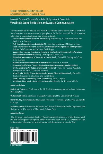 Although the fundamental principles of vocal production are well-understood, and are being increasingly applied by specialists to specific animal taxa, they stem originally from engineering research on the human voice. These origins create a double barrier to entry for biologists interested in understanding acoustic communication in their study species. The proposed volume aims to fill this gap, providing easy-to-understand overviews of the various relevant theories and techniques, and showing how these principles can be implemented in the study of all main vertebrate groups. The volume will have eleven chapters assembled from the world's leading researchers, at a level intelligible to a wide audience of biologists with no background in engineering or human voice science. Some will cover sound production in a particular vertebrate group; others will address a particular issue, such as vocal learning, across vertebrate taxa. The book will highlight what is known and how to implement useful techniques and methodologies, but will also summarize current gaps in the knowledge. It will serve both as a tutorial introduction for newcomers and a springboard for further research for all scientists interested in understanding animal acoustic signals.