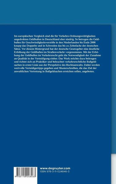 Im europäischen Vergleich sind die für Verkehrs-Ordnungswidrigkeiten angedrohten Geldbußen in Deutschland eher niedrig. So betrugen die Geldbußen für Geschwindigkeitsverstöße in den Niederlanden bis Ende 2008 knapp das Doppelte und in Schweden das bis zu Zehnfache der deutschen Sätze. Vor diesem Hintergrund hat der deutsche Gesetzgeber eine deutliche Erhöhung der Geldbußen im Straßenverkehr vorgenommen. Ab Februar 2009 wurden die Geldbußen im neuen Bußgeldkatalog teilweise sogar verdoppelt. Mit der Erhöhung der Geldbußen im Verkehrsrecht geht die Notwendigkeit der Zunahme an Qualität in der Verteidigung einher. Das Werk möchte dazu beitragen und richtet sich an Praktiker und beleuchtet verkehrsrechtliche Bußgeldsachen in erster Linie (aber nicht nur) aus der Perspektive des Rechtsanwalts. Dabei werden wertvolle Verteidigertipps gegeben und Musterschreiben, die das Ziel der anwaltlichen Vertretung in Bußgeldsachen erreichen sollen, angeboten.