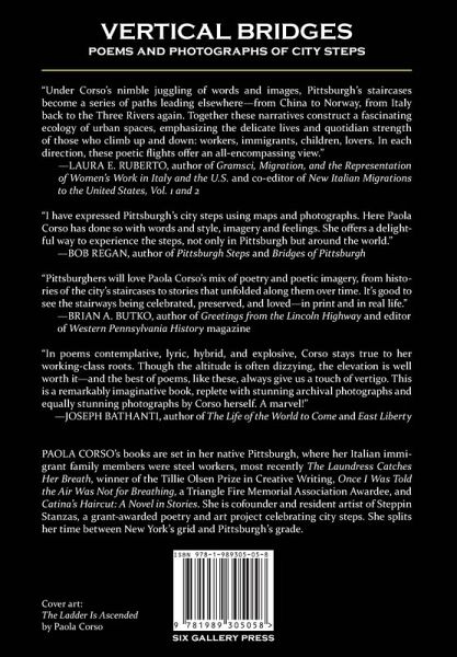 In Vertical Bridges: Poems and Photographs of City Steps, Paola Corso celebrates public stairways in her native Pittsburgh and around the world. Inspired by her Sicilian grandfather, a stonemason who built concrete steps, and her Calabrian grandfather and father, steelworkers who once climbed them to the mill, Corso is a storyteller. She shares memories of her family, the history behind Pittsburgh having more public staircases than any other city in the country, and curiosities about some of the world's most famous steps. Vertical Bridges includes photos by the author along with archival photos from the University of Pittsburgh Library's Pittsburgh City Photographer Collection.