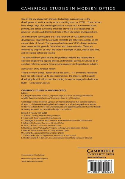 Written by those at the forefront of VCSEL research and development, provides a clear insight into the physics of VCSELs, as well as describing details of their fabrication and the massive range of their application. The chapters cover VCSEL design, emission from microcavities, growth, fabrication, and characterization, long and short-wavelength VCSELs, optical data links, and free space optical processing.