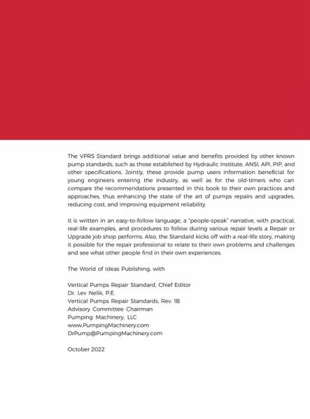 The VPRS Standard brings additional value and benefits provided by other known pump standards, such as those established by Hydraulic Institute, ANSI, API, PIP, and other specifications. Jointly, these provide pump users information beneficial for young engineers entering the industry, as well as for the old-timers who can compare the recommendations presented in this book to their own practices and approaches, thus enhancing the state of the art of pumps repairs and upgrades, reducing cost, and improving equipment reliability. It is written in an easy-to-follow language, a "people-speak" narrative, with practical, real-life examples, and procedures to follow during various repair levels a Repair or Upgrade job shop performs. Also, the Standard kicks off with a real-life story, making it possible for the repair professional to relate to their own problems and challenges and see what other people find in their own experiences. The World of Ideas Publishing, with Vertical Pumps Repair Standard, Chief Editor Dr. Lev Nelik, P.E. Vertical Pumps Repair Standards, Rev. 1B Advisory Committee Chairman Pumping Machinery, LLC www.PumpingMachinery.com DrPump@PumpingMachinery.com October 2022
