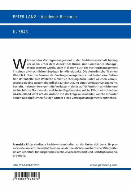 Während das Vertragsmanagement in der Rechtswissenschaft bislang vor allem unter dem Aspekt des Risiko- und Compliance-Managements erörtert wurde, steht in diesem Buch das Vertragsmanagement in seinen zivilrechtlichen Bezügen im Mittelpunkt. Die Autorin schafft einen Überblick über die Formen des Vertragsmanagements und bietet eine Definition der Inhalte. Des Weiteren nimmt sie Stellung dazu, unter welchen Voraussetzungen eine neue Nebenpflicht zur Benutzung eines Vertragsmanagements besteht. Insbesondere geht die Verfasserin dafür auf öffentlich-rechtliche und zivilrechtliche Normen ein, welche im Ergebnis eine solche Pflicht einschließen. Abschließend setzt sich die Autorin mit der Frage auseinander, welche mitunter neuen Nebenpflichten für den Nutzer eines Vertragsmanagements entstehen.