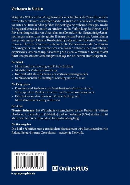 Steigender Wettbewerb und Ergebnisdruck verschlechtern die Zukunftsperspektive deutscher Banken. Zusätzlich hat die Finanzkrise zu deutlichen Vertrauensverlusten bei Bankkunden geführt. Eine erfolgversprechende Strategie, um die Ertragsprobleme der Banken zu mindern, ist die Verbindung des Firmen- und Privatkundengeschäfts von Unternehmern (Konnektivität). Gegenwärtige Untersuchungen zeigen, dass hier großes Ertragspotenzial besteht und Unternehmer ihre private und geschäftliche Bankbeziehung aufgrund von mangeldem Vertrauen trennen. Thorsten Steinmann untersucht die Determinanten des Vertrauens in Management und Kundenberater von Banken anhand einer großzahligen empirischen Untersuchung. Zusätzlich prüft er, ob Vertrauen zu Konnektivität führt und präsentiert Gestaltungsvorschläge für ein Vertrauensmanagement.